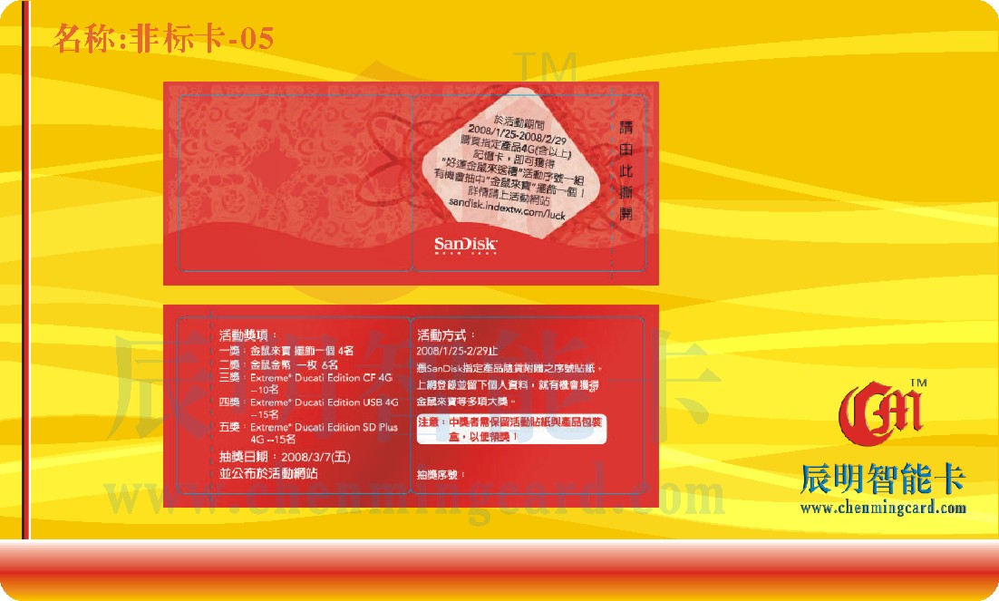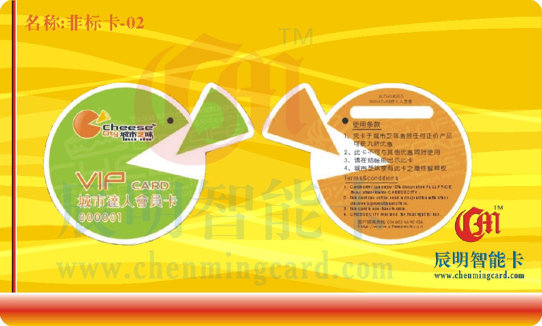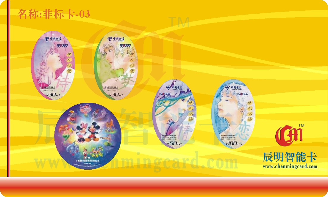 ● 異形卡是根據(jù)個性化需求量身訂做的非國際標(biāo)準(zhǔn)卡。可選擇的卡基厚度有 0.3mm 、0.4mm、0.5mm 、 0.6mm 、0.76mm 、1.0mm?ㄆ愋陀蟹叫停瑘A型,三角型等各種形狀,客戶可以隨心在我們這里訂做,根據(jù)自己的產(chǎn)品形象設(shè)計出精美的卡片。